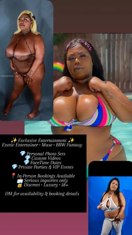 Your Juicy Goddess is here, looking for sincere and generous gentlemen! Tell me your wants and desires and I will be your fantasy. I am a soft, thick juicy BBW Queen๐ I have succulent huge tits๐ I am very clean, I always smell good and sweet๐ญ My personality is sweet and bubbly, party girl!๐๐ธ Plus I guarantee satisfaction each time. Add Me on Onlyfans free: ๐ฆ onlyfans.com/thebbwbarbieee
